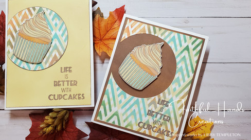 To finish it all off, I ink-blended Vintage Photo and Scattered Straw on 4 x 5/14 card panels for the Guys and Victorian Velvet and Brilliance Galaxy Gold for the Gals. For the first card, I adhered the stenciled panel to the brown background and stamped the sentiment using my Misty with Vintage Photo. For the 2nd card, I inked around the edges of the card panel and the stenciled circle with Vintage Photo for additional pop and then placed the circle in place. Once again, I stamped the sentiment with Vintage Photo. After the bases were ready, I placed some fun foam on the back of the cupcakes and adhered them within the circles. I glued the final panels on the card bases. Another quick set of 2-for-1 cards!